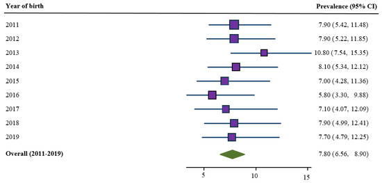 The prevalence of babies with LBW among mothers who reported smoking during pregnancy for the period (2011–2019) in SNSWLHD is almost eight percent (Figure 2). Even though the prevalence of LBW fluctuated between 2011 and 2019, the observed differences in fluctuation were not statistically significant.