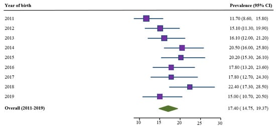 Prevalence of self-reported smoking cessation during the second half of pregnancy for the period 2011–2019 was estimated to be 17.40% (Figure 3). Prevalence of smoking cessation increased significantly (by 75%) between 2011 and 2014. Since 2014, fluctuation in smoking cessation occurred, with a 27% non-significant decrease in 2019 compared to 2014.