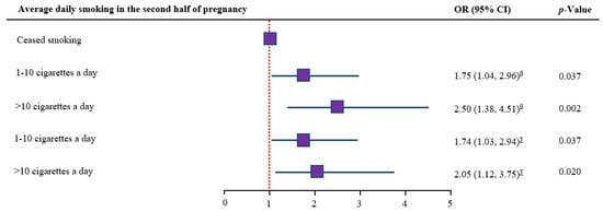 A dose-response analysis revealed that LBW is significantly associated with mothers with an average daily smoking of 1–10 (aOR = 1.74; 95% CI: 1.03, 2.94, p = 0.037) or >10 cigarettes (aOR = 2.05; 95% CI: 1.12, 3.75, p = 0.020) during the second half of pregnancy compared to those who ceased smoking during the second half of pregnancy (Figure 4).