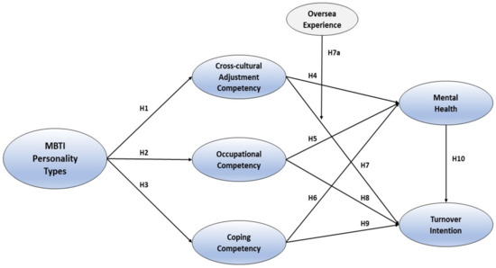 The purposes of this study were (1) to identify MBTI (Myers–Briggs Type Indicator) personality profiles of Korean cabin crew in Middle Eastern airlines, (2) to determine whether MBTI personality affects their cross-cultural adjustment competency, occupational competency, and coping competency, and (3) to analyze the impact of these variables on their mental health and turnover intention. Furthermore, we verified (4) the moderating effect of cabin crew’s previous overseas experience on the relationship between cross-cultural adjustment competency and turnover intention. MBTI-Form M test and a survey questionnaire were distributed to 185 Korean cabin crew members in Middle Eastern airlines, and 172 valid datapoints were used for analysis. It was revealed that the cabin crew members showed significantly different levels of cross-cultural adjustment competency, occupational competency, and coping competency depending on their personality traits. Furthermore, those with higher cross-cultural adjustment competency and stress coping are more likely to have positive mental health, which also had an influence on lowering their turnover intention. Occupational competency had no significant association with mental health; however, it directly affects turnover intention. The findings will contribute not only to career plan guidelines for cabin crew aspirants, but also to airlines’ recruitment strategies as well as human resources management in aviation industry.