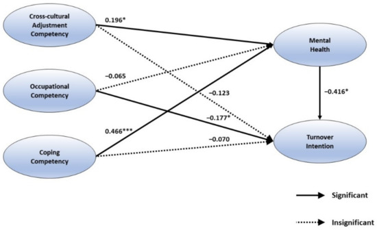 Hierarchical multiple linear regression analysis following Baron and Kenny [73] was used to measure the effects of cross-cultural adjustment competency, occupational competency, and coping competency on mental health and turnover intention.