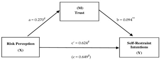 p = 0.001). A 95% bias-corrected confidence interval based on 10,000 bootstrap samples indicated that the indirect effect (ab = 0.025) was entirely above zero (0.009 to 0.045). Moreover, higher levels of risk perception corresponded to higher self-restraint intentions even after taking into account risk perception’s indirect effect through trust (c’ = 0.624,