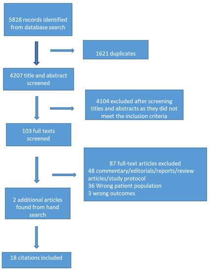 The search identified 5828 articles; we removed 1621 duplicates, which left 4207 unique citations. We excluded articles based on title/abstract screening (n = 4104). The majority of these articles pertained entirely to adults or university students over the age of 18. We retrieved 103 full-text articles, 16 of which met the inclusion criteria. We identified an additional two articles by scanning the reference lists of the included articles and added them, for a total of 18 articles (Figure 1).