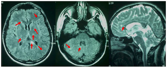 Magnetic resonance of the brain: the red arrows show various rotund and ellipsoid focal lesions involving the corpus callosum, periventricular and subcortical white matter, deep grey matter (basal ganglia and thalami), and cerebellum.