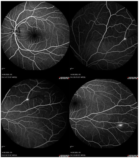 A 33-year-old man was admitted to the emergency unit for headaches, a referred visual field loss, dizziness, and weakness of the limbs. The patient had a history of malignant external otitis [13], hearing loss, and cochlear implant surgery [14,15,16] and used a mandibular advanced device for obstructive sleep apnea syndrome [17]. Neurological evaluation demonstrated a decrease in attention and memory, ataxia, dysmetria, and mild weakness of the extremities. Although the brain CT scans were normal, MRI revealed numerous rounds and focal lesions in the corpus callosum, subcortical white matter, deep grey matter (basal ganglia and thalami), and cerebellum (Figure 1). Additionally, laboratory analyses were normal while anti-smooth muscle antibodies (ASMA), anti-nuclear antibodies (ANA), and anti-cardiolipin IgM antibodies were positive. Two years ago, the patient underwent photorefractive refractive keratectomy (PRK) for myopia [18]. His best-corrected visual acuity (BCVA) was 20/20 Snellen in both eyes, with spherical equivalent refractions of −0.75 in the right eye and of −0.50 in the left eye. The intraocular pressure was 16 mmHg in both eyes (Goldmann Applanation Tonometer). Anterior segment examination was normal in both eyes; however, fundus evaluation showed ischemic retinal whitening in the inferior-temporal and nasal periphery outside the vascular arcades, related to BRAO. FA was performed by a Heidelberg retina angiograph (HRA II, Heidelberg Engineering, Dossenheim, Germany), showing in both eyes arterial occlusion with vasculitis signs (Figure 2). Finally, considering the clinical, laboratory, serological, and neuro-radiological findings, SS was diagnosed. Further ophthalmologic investigations were conducted; in particular, the patient underwent multimodal retinal imaging including wide-field color fundus photography acquired using a non-mydriatic fundus camera (Canon CR-2, Tokyo, Japan) and high-definition optical coherence tomography angiography (OCTA, Angio OCT Scans, Heidelberg Engineering, Heidelberg, Germany). Color fundus photography confirmed a slight area of retinal ischemia observed in a fundus examination conducted first and revealed the existence of glass plaques as yellowish lipid sediments at the mid-segment of the retinal arterioles (Figure 3). The autofluorescence images did not show specific alterations in physiological retinal autofluorescence. The OCTA scans revealed decreased vascular perfusion in correspondence with the ischemic area, previously observed in FA, as well as an increased foveal avascular zone (FAZ) area in both superficial and deep vascular plexuses (Figure 4). OCT also showed a reduction in the formation of the inner limiting membrane to internal nuclear layer areas.
