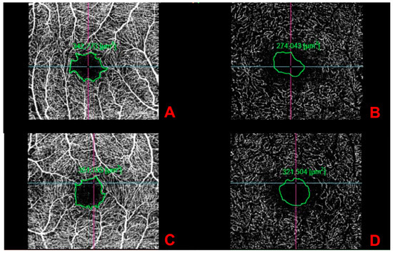 Foveal avascular zone enlargement in optical coherence tomography angiography images of the superficial and deep layers (A,B) right eye; (C,D) left eye).