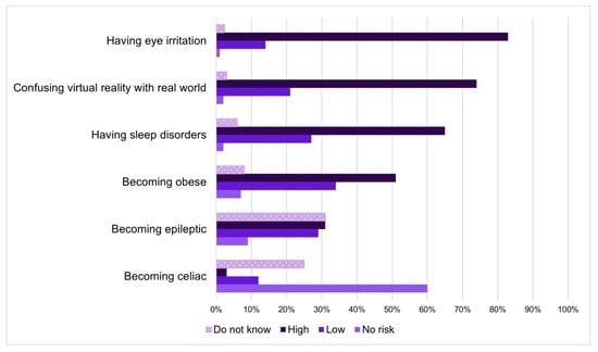 Most of the respondents considered that MDs use could be harmful for 0–5-year-old children’s health. In order to better interpret the overall risk perception, participants were asked to rate specific risks and benefits related to MDs use. A high prevalence ranging from 60% to 80% of participants indicated sleep disturbances and developing eye irritation as situations related to risk. In fact, continuous eye exposure to close screens causes faster evaporation of the tear film, which may lead to dry eye disease and ocular fatigue []. The same goes for sleep quality, where evidence supports a correlation between any form of screen-time (MDs, television and computer) and poor sleep outcome (delayed bedtime, shortened total sleep time, daytime tiredness and sleep-onset latency) []. Evidence specifically relating to the 0–5-year-old group is still poor but supports these findings. The risk of confusing virtual reality with the real world is also perceived as a high risk in most cases (74%). In fact, children’s learning is subordinated to direct experience in the real world, as described by Bozzola and co-authors, who claimed that in this age group, infants’ and toddlers’ touch screen usage might interfere with learning development []. They need direct first-hand experience with materials and equipment that challenge their thinking and problem-solving skills [].