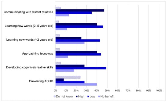 Communicating with distant relatives (n = 1448; 47%) was the situation most perceived as beneficial by participants. All other possible benefits related to the use of MDs were perceived as high by less than 50% of the sample (approaching technology, learning new words, developing cognitive/creative skills). Preventing ADHD (Attention Deficit Hyperactivity Disorder) was not indicated as a benefit by 40% of the sample. However, 25% (n = 755) of respondents were not able to give a score. Twenty-eight percent of respondents (n = 869) stated that learning new words was not a benefit related to the use of MDs by children under the age of 2 years, and to a greater extent when referring to children aged 3–5 years (11%, n = 349) (p < 0.001).