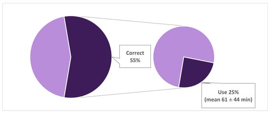 Comparison between opinions about the correct time of use by children aged 3–5 years and responses about the actual use (Correct = one hour maximum) []. Analyses limited to parents having only children aged 3–5 years or both children aged 0–2 and 3–5 years.