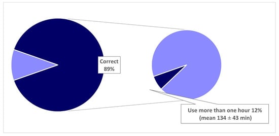 With regard to MDs use in children aged 3–5 years, 89% (n = 1083) of parents with children aged 3–5 years or children belonging to both age groups indicated that it was correct to allow use of MDs for up to a maximum of one hour a day, and 12% of them allow their children to use it for more than an hour (Figure 4). The mean time of use reported was 134 ± 43 min, and the use alone occurred in 78% of cases. Overall, 62% (n = 796) of this group of parents declared to allow the use of MD by their children, and alone in 54% (n = 426) of cases.