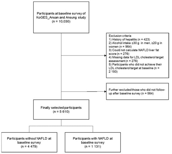 From the 10030 participants in the baseline survey, we excluded those who (1) had a history of hepatitis (n = 423), (2) consumed ≥30 g of alcohol per day in men or ≥20 g per day in women (n = 964), (3) had no data with which to calculate NAFLD liver fat scores (n = 276), (4) had no data with which to evaluate LDL cholesterol targets according to individual CVD risk (n = 276), and (5) achieved their LDL cholesterol target at the baseline survey (n = 2193). Of the remaining 6174 participants, 564 participants who had no follow-up data after the baseline survey were further excluded. Finally, a total of 5610 participants (1131 participants with NALFD and 4479 participants without NAFLD) were analyzed in the study (Figure 1). Informed consent was obtained from all eligible participants. This study was approved by the Institutional Review Board (IRB) of Yongin Severance Hospital (IRB number: 9-2020-0043).