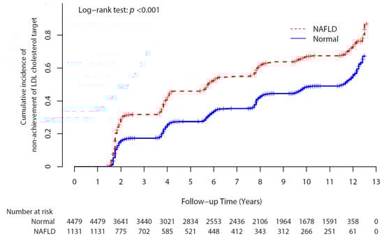 A total of 2819 (50.3%) participants experienced non-achievement of their LDL cholesterol targets. The cumulative incidences of non-achievement of LDL cholesterol targets according to NAFLD status are presented in Figure 2 as Kaplan–Meier curves. The NAFLD group had higher cumulative incident non-achievement of LDL cholesterol targets than the normal group over 12 years of follow-up with significance (log-rank test p < 0.001).