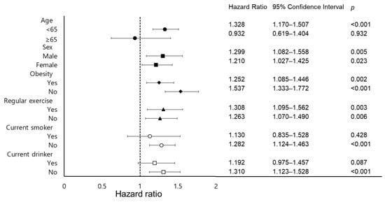 Figure 3 shows the results of subgroup analyses (age group, sex, obesity status, physical activity, smoking status, and alcohol drinking status) of the relationship between NAFLD status and non-achievement of LDL cholesterol targets, presented as HRs with 95% CI values. After adjusting for all potential confounding variables, except for each subgroup variable, there were significant associations between NAFLD and incident non-achievement of LDL cholesterol targets in the subgroup of individuals younger than 65 years in both sex subgroups, in both non-obesity and obesity subgroups, in both non-regular exercise and regular exercise subgroups, in non-smokers, and in non-drinkers, whereas older age, current smokers, and current drinkers did not show a significant relationship.