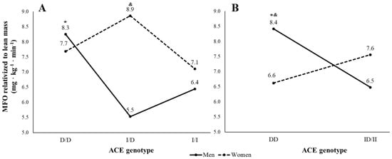 Interaction of sex and genotype of Angiotensin-converting enzyme (ACE) gene I/D polymorphism in Maximal Fat Oxidation (MFO) relativized to lean mass. Panel (A) shows the analysis considering the three ACE gene variants (DD, ID and II) after accounting by body fat percentage. Panel (B) shows the analysis according to the recessive model of ACE gene (DD vs. ID/II). * p ≤ 0.05 vs. other genotype groups. & p ≤ 0.05 vs. women of the same genotype group. Sample size was 11 and 12 men and women respectively in DD, and 35 and 16 men and women respectively in ID/II in Panel (A,B).