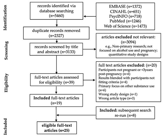 Secondary analyses, grey literature, and research published in languages other than English were excluded. Studies where the participants were not identified as pregnant or recently postpartum, where the postnatal period was undefined, or that only included women more than three years postpartum were excluded. Moreover, studies where pregnant or recently postpartum women’s voices were not identifiable (e.g., among women of reproductive age) or where the focus was not primarily on alcohol use in pregnancy (e.g., primary focus on opioid or tobacco use) were also excluded.