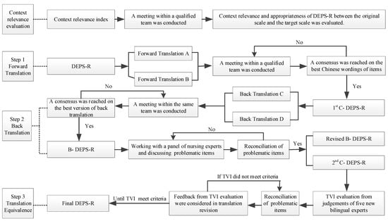 This study is the first to report on the context relevance evaluation and detailed translation process of the DEPS-R into a different context or language. In this study, a consensus of context relevance was achieved with high CRI to quantify the lack of significant context difference, laying the foundation for the subsequent translation. The translation process followed the Brislin’s translation model and TVI was used to quantify the quality of the translation, assuring fidelity to the original instrument.