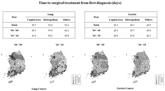 Figure 1 presents the national trend of time-to-treatment in the study participants. The average period of time-to-treatment in lung cancer patients was shortest in patients living in the capital area (45.7 days) and longest in patients at other areas (54.2 days). Over the past 10 years, the average time-to-treatment for lung cancer patients decreasing in all regions. In the case of gastric cancer, unlike lung cancer, the average period of time-to-treatment was longest in the capital area. Overall, treatment time had declined in the past 10 years.