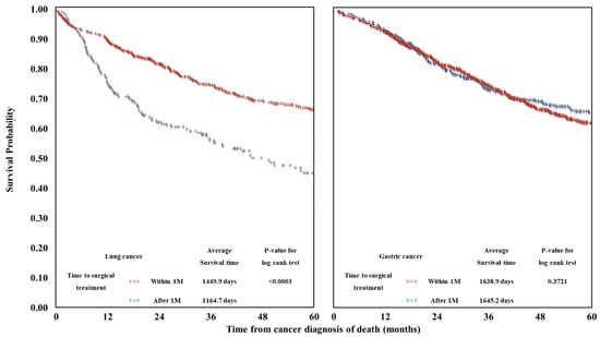 In this study, the association between time to surgical treatment and mortality in patients with gastric or lung cancer was investigated. We hypothesized that delayed treatment can reduce survival, especially in lung cancer patients with poor prognosis. Furthermore, a subgroup analysis was performed to evaluate the impact of treatment type and the location of the medical institution first visited for treatment on survival rate as these factors can affect patient outcomes.