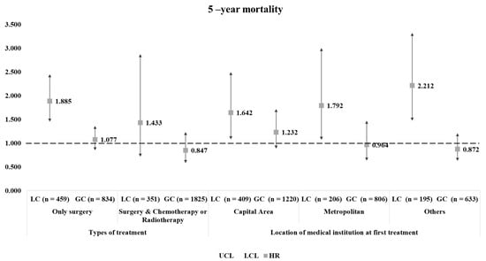 Figure 3 reveals the results of the subgroup analysis. The trends shown in the main analysis was generally maintained. Interestingly, the higher risk of 5-year mortality seen among lung cancer patients experiencing treatment delays were statistically maintained in patients who received only surgical treatment. Higher 5-year mortality risks found in lung cancer patients who received treatment after 50 days were maintained in the non-capital-area group (metropolitan HR: 1.792, 95% CI: 1.070–3.002; others HR: 2.212, 95% CI: 1.472–3.322).