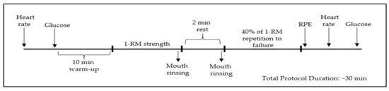 Following the first session which was used as a familiarization, participants were randomized in a cross-over, counterbalanced, double-blind design, to four experimental conditions: mouth rinsing with a 6% carbohydrate solution (LCHO), 12% carbohydrate solution (MCHO), 18% carbohydrate solution (HCHO) or water as a placebo (PLA). Experimental sessions were conducted on different days (48 h apart). Bench press strength (1-RM) was assessed according to procedures described by Clarke et al. [21]. Muscular endurance performance was tested at 40% of their 1-RM until failure. Upon arrival at the laboratory, participants warmed up for 10 min on a treadmill followed by assessment of muscular strength and endurance, interspersed by a standardized 2 min rest period. Heart rate (HR) (Polar Team 2 telemetric system, Kemple, Finland), ratings of perceived exertion (RPE) (6–20 Borg) [30], and capillary glucose (GLU) (Accutrend Plus, Roche Diagnostics, Mannheim, Germany) were determined immediately after the endurance test, as shown in Figure 1. Blood sample were taken from a fingertip. Participants completed all sessions in the morning (08:00–10:00) following a 10 h overnight fast. The rinsing solutions were coded by a non-affiliated researcher to ensure double blinding. Participants were asked to avoid caffeine and alcohol intake and vigorous exercise in the 24 h leading up to each visit. Further, a 24-h dietary intake was recorded, and participants were asked to replicate it prior to each experimental condition. Diet was also confirmed verbally prior to each testing session.