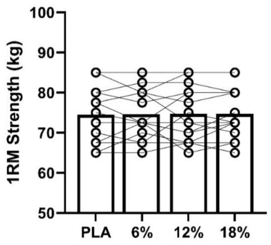 No significant differences in 1-RM were observed between conditions (F3,45 = 0.106, p = 0.95, η2 = 0.01) and showed high ICC (0.94) (Figure 2).