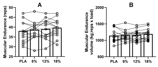 Furthermore, muscular endurance for total repetitions (F3,45 = 2,533, p = 0.06, η2 = 0.14; Figure 3A) and total volume (F3,45 = 1.588, p = 0.20, η2 = 0.09; Figure 3B) were not significantly different between conditions. Repetition numbers and total volume (repetitions × load) showed high ICC (0.96 and 0.94, respectively).