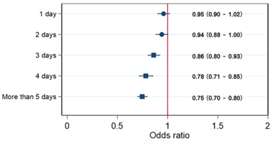 iLogistic regression was used to determine the relationship of stress with the frequency of vigorous PA. The OR was significantly decreased when vigorous PA was performed for more than three days a week, 0.87 (0.82–0.93); more than four days a week, 0.79 (0.72–0.87); and more than five days a week, 0.76 (0.71–0.81) (p < 0.05) (Figure 1).