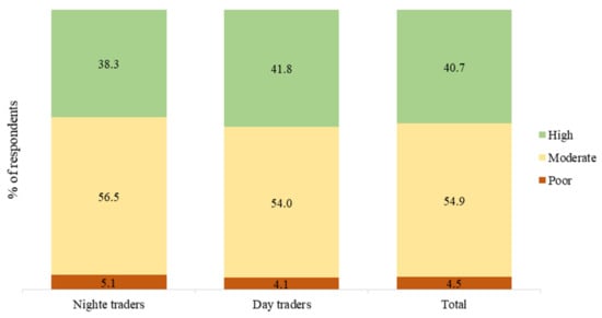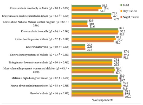Tetteh-Quarcoo, P.B.; Dayie, N.T.K.D.; Adutwum-Ofosu, K.K.; Ahenkorah, J.; Afutu, E.; Amponsah, S.K.; Abdul-Rahman, M.; Kretchy, J.-P.; Ocloo, J.Y.; Nii-Trebi, N.I.; et al. Unravelling the Perspectives of Day and Night Traders in Selected Markets within a Sub-Saharan African City with a Malaria Knowledge, Attitude and Practice Survey. Int. J. Environ. Res. Public Health 2021, 18, 3468. https://doi.org/10.3390/ijerph18073468