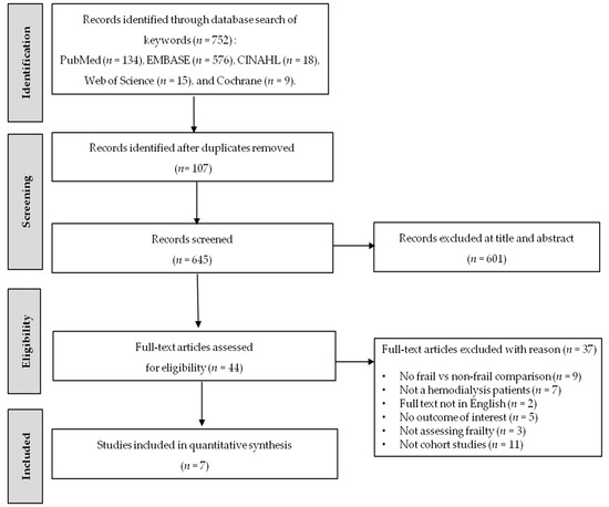 Chicago/Turabian StyleLee, Hyeon-Ju, and Youn-Jung Son. 2021. "Prevalence and Associated Factors of Frailty and Mortality in Patients with End-Stage Renal Disease Undergoing Hemodialysis: A Systematic Review and Meta-Analysis" International Journal of Environmental Research and Public Health 18, no. 7: 3471. https://doi.org/10.3390/ijerph18073471