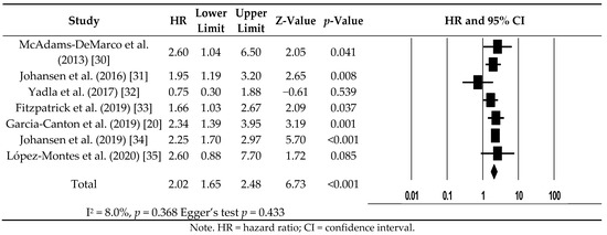 | Garcia-Canton et al. (2019)/Spain [20] | Prospective | 29 | Edmonton Frail Scale | Scoring ≥8 | n = 82 Median age: 71.0 (years) Male: 42 (52.4%) | n = 195 Median age: 63.5 (years) Male: 139 (71.3%) | 29.6 | All-cause mortality | CCI | 8 |