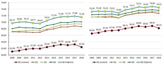 HALE by gender and income level showed that HALE increased from 2008 to 2018, for all income levels, and for both males and females. Identified trends by year were as follows: For males, at Q1, the lowest income level, HALE was 61.09 years in 2008, and gradually increased by 1.35 years to 62.44 years in 2018. At Q5, the highest income level, HALE increased by 1.86 years from 69.73 years in 2008 to 71.59 years in 2018. For females, at Q1, HALE was 66.60 years in 2008, and gradually increased by 1.63 years to 68.23 years in 2018. At Q5, HALE increased by 1.24 years from 73.29 years in 2008 to 74.53 years in 2018. The increase in HALE for all income levels for both males and females was statistically significant (p < 0.05). For males, the gap in HALE according to income level increased by 0.51 years from 8.64 years in 2008 to 9.15 years in 2018. On the other hand, for females this gap decreased from 6.70 years in 2008 to 6.30 years in 2018, while males have a greater gap in HALE by income level than females. That is, inequality in HALE according to income level is considered to be greater in males. However, in both males and females, the increase in the HALE difference according to income levels was not statistically significant by year (Figure 1).
