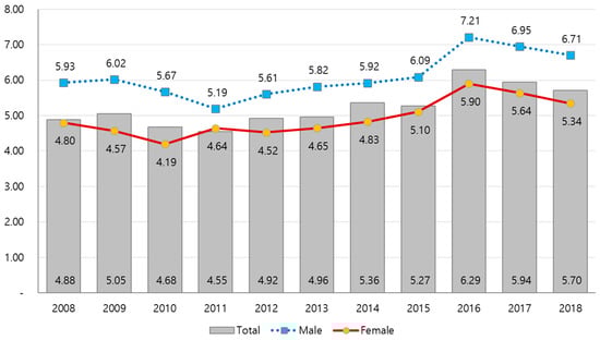 The gap in life expectancy by gender decreased from 6.55 years in 2008 to 6.03 years in 2017 []. The gap in life expectancy by income level also decreased from 6.90 years in 2008 to 6.48 years in 2017. According to the results, the gap in gender has been on the decline, from 4.53 in 2008 to 4.12 in 2018, and the gap based on income levels decreased from 7.94 in 2008 to 6.72 in 2012, thereafter increasing to 8.04 years in 2018. The lowest income level group, especially, has lower HALE compared to other quintiles. Several studies show that smoking, alcohol usage, and other health behaviors of the low-income bracket are worse than in other brackets [,,]. We need intensive management for the low-income group to promote HALE at the national level. Research is needed on how to set goals to manage health hazards by calculating population attributable fractions (PAF), a fraction that major health hazards such as smoking, drinking, and obesity contributed to YLD, and improving HALE by preventing certain diseases.