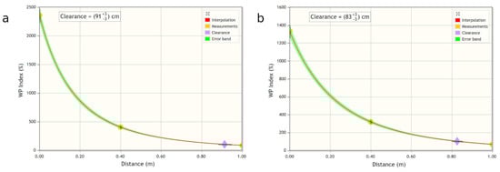 The resulting values are 91 ± 3 cm at 100 cm from the ground and at 83 ± 3 cm at 160 cm from the ground. These distances identify the boundary between “Zone 0” and “Zone 1a” according to EN 50499:2019-10 [].
