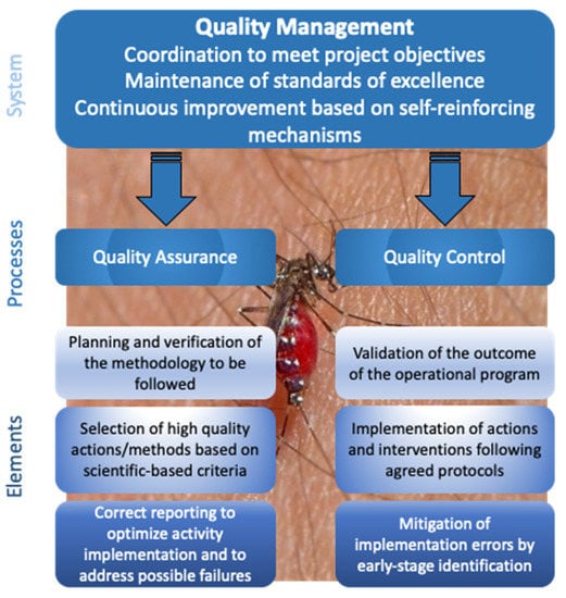 Schematic outline of quality management processes and elements (background: Aedes albopictus receiving blood meal from human arm, photo by Stihios Serafim).