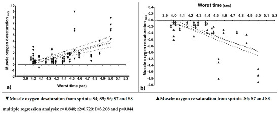 - The muscle oxygen desaturation rate was evaluated as the difference between the maximum (work interval) and minimum SmO2 values (rest interval) and divided by the duration of the work interval. Similarly, the muscle oxygen re-saturation rate was determined as the difference between the minimum (rest interval) and maximum SmO2 (working interval), divided by the rest duration of the interval (20 s) [10].