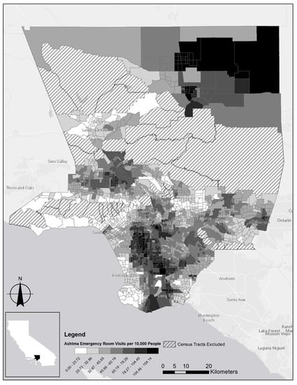 The dependent variable of the model is the emergency department visits for asthma per 10,000 people for the three-year period from 2011 to 2013 (Figure 1). These data were extracted from the CalEnviroScreen 3.0, which was updated in 2018. The CalEnviroScreen 3.0 refers to an environmental health screening tool for the communities in California. It was designed not only to evaluate multiple pollutants and stressors at the local but also to assist local agencies in carrying out their environmental justice missions []. Based on hospitals’ emergency medical service report to California Office of Statewide Health Planning and Development (OSHPD), the CalEnviroScreen 3.0 provides the data by census tract. It is noteworthy that the dependent variable differs from the number of asthma patients. Due to the lack of individual asthma patient data, this paper employs the emergency department visit data. Considerable research employed asthma emergency room visit data as a proxy variable [,,,,] Furthermore, some research reports that built environment presents a stronger correlation with severe asthma than with asthma morbidity [,]. Hypothesizing that asthma patients who visited emergency rooms experience severe asthma, the dependent variable can appropriately provide the insight of the relationship between asthma morbidity and greenspace.