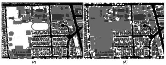 Example of tree and open/greenspace data. Note: (a) an aerial image that illustrates an actual urban area with diverse land uses with 0.3 m by 0.3 m resolution (source: ESRI), (b) conventional land cover data from Landsat satellite imagery that captures greenspaces (white) with 30 m by 30 m resolution (source: National Land Cover Database), (c) LARIAC land cover data that capture greenspaces (white), and (d) LARIAC tree data that capture trees (white) with 0.2286 m by 0.2286 m resolution (source: LARIAC).
