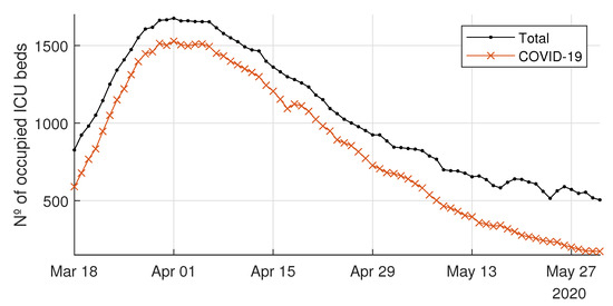 6]. If we look at the situation of beds in the CoM’s hospitals to describe their evolution, which is the main objective of this paper, it can be seen that the number of patients hospitalized just for COVID-19 in the intensive care units (ICUs) was 1514, and 13,713 patients were in beds other than intensive care (non-ICU). However, the situation can be described even better by comparing the figures of the CoM beds with those of Spain: 5872 (ICU) and 45,546 (non-ICU) [