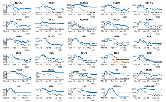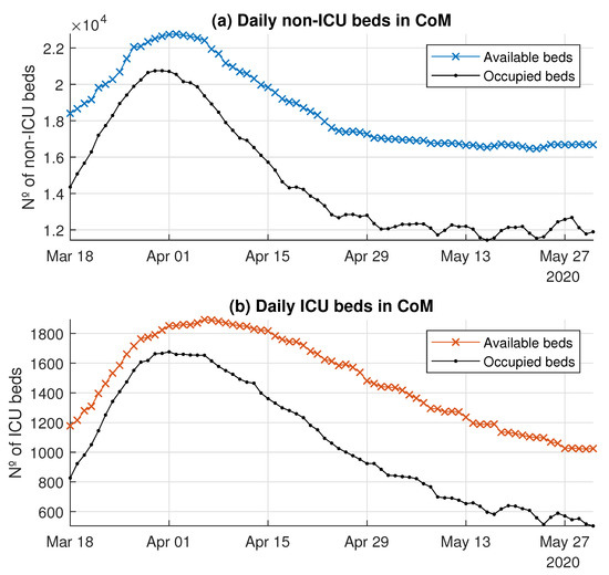 Due to the need to hospitalize a huge number of COVID-19 patients, which increased relentlessly with different degrees of severity during this first wave, the CoM’s hospitals rapidly increased their capacity to levels never seen before. Not only the number of hospital beds, but also the intensive support and invasive ventilation were of concern, as COVID-19 is a disease with a potentially fatal evolution. These circumstances meant that the number of available beds had to be increased from 18,692 (18 March 2020) to 23,623 (2 April 2020) in just 15 days, i.e., an increment of 26.4%. Although the first admission for COVID-19 in a CoM hospital occurred on 25 February 2020, in this paper, we analyze the data for the period between 18 March 2020 and 31 May 2020. The first date corresponds to the first day on which we had the complete data of the hospitals that are analyzed in this article.