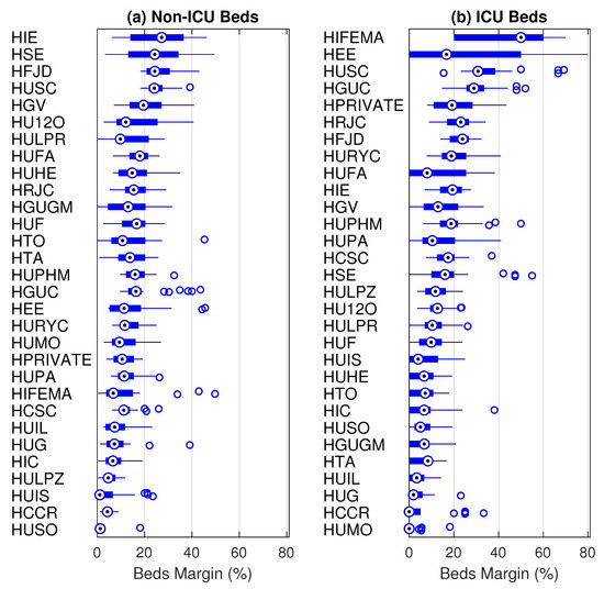 Figure 11, left) lower than 25% for at least 75% of the days, and one of them presented a median bed margin of 1.3% (five beds). Focusing on ICU beds, the lack of unoccupied beds in several hospitals over several days was notorious (