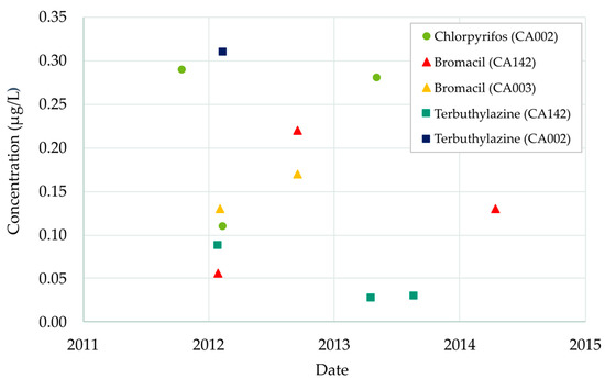 Figure 3 shows the evolution over time of the registered pesticide concentrations in the aquifer between 2011 and 2014. MCLs were exceeded eight times in the three observation wells (CA002, CA003 and CA142) during the 2011–2015 period.