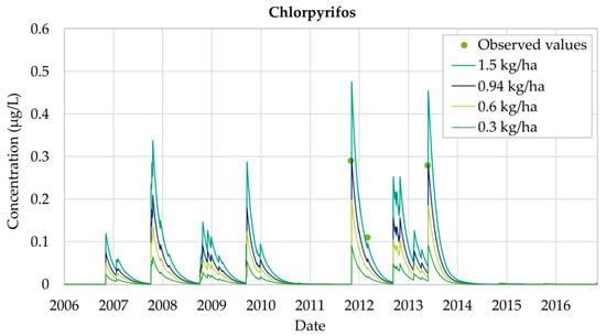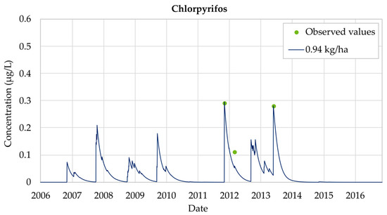 Chlorpyrifos analysis leads to accurate results, maintaining good adjustments between observations and simulated results throughout the 2006–2016 simulation period. Model results show that general trends are properly reproduced and MCL values (0.1 μg/L) are only temporarily overcome. The use of the model allows confirmation that maximum Chlorpyrifos concentration values coincide in times when applications to the soil occur.