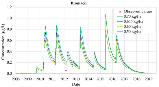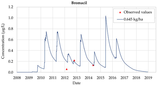 The best calibration of the model was obtained considering an annual Bromacil application equal to 0.645 kg/ha. Figure 7 shows the results obtained for this scenario, for which all the observed values but one are well reproduced. The only observation that is not properly reproduced is the one taken on 3 July 2012. On this date the observed concentration was equal to 0.06 μg/L, while the simulation result overestimates this value (0.20 μg/L). There are many reasons that can cause these differences, including errors in the measurement process. The record on 25 October 2012 is equal to 0.22 μg/L, while the simulated value is 0.20 μg/L. On 28 May 2014, a Bromacil concentration equal to 0.13 μg/L was observed and this value is accurately reproduced by the model. On 15 June 2015 the maximum concentration value was reached, and concentrations finally decreased to zero by the end of 2018.