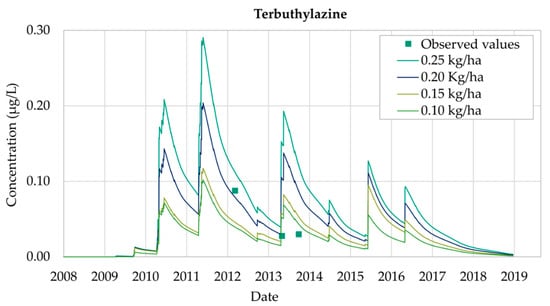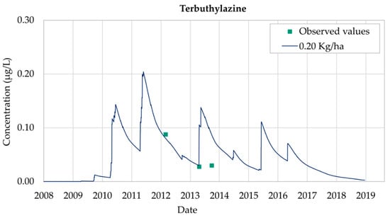 The best fit of the observed data is obtained with an application value of 0.20 kg/ha. Figure 9 shows the simulated values of Terbuthylazine concentrations in groundwater for this scenario during the simulation period 2008–2018, after the calibration process had been performed. The maximum simulated concentration value is 0.20 μg/L, obtained on 19 May 2011.