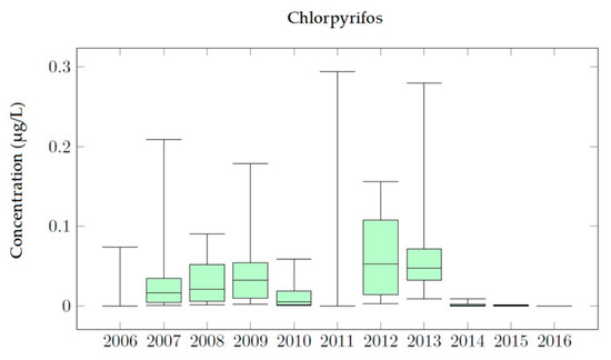 Box plot diagram of Chlorpyrifos simulations in Well 08.140.CA002 (La Purísima) in 2006–2016.