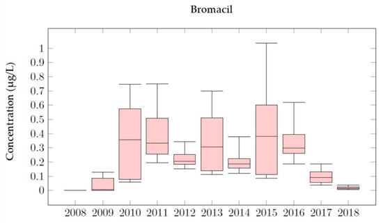 Box plot diagram of Bromacil simulations in Well 08.140.CA142 (Llano de Cuarte) in 2008–2018.