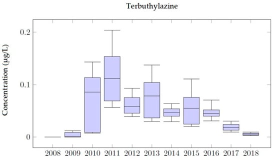 Box plot diagram of Terbuthylazine simulations in Well 08.140.CA142 (Llano de Cuarte) in 2008–2018.