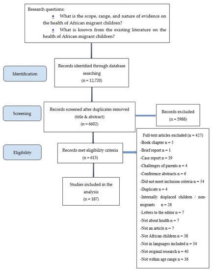 Salami, B.; Fernandez-Sanchez, H.; Fouche, C.; Evans, C.; Sibeko, L.; Tulli, M.; Bulaong, A.; Kwankye, S.O.; Ani-Amponsah, M.; Okeke-Ihejirika, P.; et al. A Scoping Review of the Health of African Immigrant and Refugee Children. Int. J. Environ. Res. Public Health 2021, 18, 3514. https://doi.org/10.3390/ijerph18073514