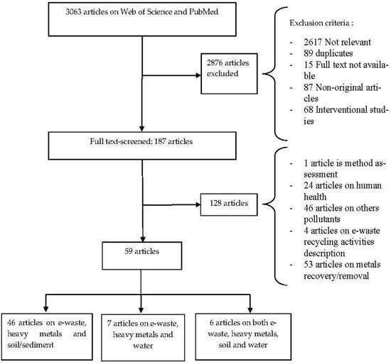 A systematic review method was developed based on guidance from the United States Office of Health Assessment and Translation [33]. A literature search using MEDLINE and Web of Science (on 7 February 2018) was conducted using the following parameters: ((metals OR “heavy metal” OR mercury OR Hg OR Lead OR Pb OR chromium OR Cr OR cadmium OR Cd OR Arsenic OR As)) AND (((Sediment OR soil OR water)) AND ((((E-waste) OR “electronic waste”) OR WEEE) OR (“waste electric and electronic equipment”))).