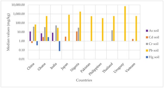 The median values of the concentrations of heavy metals in the soil by country are summarized in Figure 2. In addition, Table 2 summarizes the middle and upper values of each heavy metal, each sample type and sample size. The Supplemental Materials provide details on sample sizes and middle and upper values of each heavy metal.